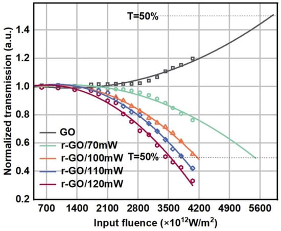 Figure 7 shows the optical limiting (OL) curves for GO/r-GO. The results show that the optical limiting efficiency of all r-GO films is significantly higher than that of GO and reversed (the optical limiting threshold is the point at which the transmittance of a material decreases to 50% of its linear value) [35]. The r-GO films have higher sp2 domains than GO, and therefore exhibit stronger optical limiting efficiencies [36]. In addition, both GO and r-GO exhibit effective optical power limitation, with the output beam starting to deviate from linearity after reaching a certain threshold (Figure 7) [34]. The starting value of the optical limit for GO dispersion is about 5.85 × 1015 W/m2, and that of the optical limit for r-GO/120 mW dispersion has the lowest onset value of about 3.5 × 1015 W/m2, 1.4 times that of GO. These results further demonstrate that the ONL and OL properties of GO are enhanced after femtosecond laser direct writing fabrication. Moreover, the ONL and OL intensities of r-GO rise with the increase in laser power. Chen et al. employed femtosecond laser pulses with a central wavelength of 800 nm, a pulse width of 120 fs, and a repetition frequency of 80 MHz to reduce graphene oxide thin films. The study identified an optimal laser output power range of 3 mW to 8 mW for effective GO patterning [37]. Compared with the pulse width of 100 fs in this paper, the pulse width they used is larger. According to the energy equation , when the energy is certain, the power damage threshold decreases as the pulse width increases. Consequently, they have a lower power threshold. Yung et al. examined the impact of various laser energy densities on the reduction process. The results indicate that as the laser energy increases, a distinct 2D peak emerges, and the degree of reduction progressively enhances [38]. From the above study, we can see that under the conditions of the same power, wavelength and repetition frequency, the pulse width is proportional to the degree of reduction. Energy density is proportional to the degree of reduction. The wavelength is proportional to the damage threshold when other conditions are the same. Electrical conductivity and ONL also increase with the degree of reduction.