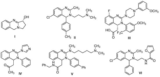 3,4-Dihydroquinazoline is a versatile nitrogen-containing heterocyclic scaffold found in many bioactive compounds with diverse biological activities (Figure 1). For example, vasicine (I), a natural alkaloid from Adhatoda vasica, exhibits various bioactivities [1,2,3]. Synthetic derivatives of 3,4-dihydroquinazoline have been developed as antiparasitic (II) [4], antiviral (III) [5,6], and antifungal (IV) [7] agents, T-type calcium channel blockers (V) [8,9], and tryptophan reductase inhibitors (VI) [10]. Consequently, various synthetic methods have been established for the construction of 3,4-dihydroquinazoline skeletons [11,12,13,14,15,16,17,18,19,20,21,22]. However, most of reported reactions need harsh conditions and require metal catalysis or special reagents, such as harmful carbodiimide, isocyanate, azide, and isocyanide derivatives. The limitations of these methods for synthesizing such alkaloids heavily impede their biological studies. Hence, the discovery of novel and more direct approaches for the synthesis of such compounds from simple starting materials is highly welcome.