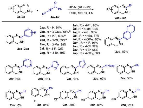 As the enaminones 1 could be readily prepared from the Michael addition of the aliphatic amines 3 to ynones 4 [46], we employed a straightforward one-pot strategy to synthesize the desired 3,4-dihydroquinazoline products 2 directly from the 2-(aminomethyl)anilines 3 and ynones 4, without isolating the enaminone intermediates 1. To our delight, from the one-pot strategy, 2-phenyl-3,4-dihydroquinazoline 2aa was afforded at a comparable yield to that from enaminone 1aa (94% vs. 96%). Then, the scope of ynones 4 was explored. As illustrated in Scheme 2, When R2 was an aryl substituent, steric effects exert a pronounced influence on the reaction. Substrates with ortho-substituents, such as methoxy, fluorine, or chlorine, experience significant steric hindrance, which interferes with the nucleophilic attack of the amino group on the C=C double bond. Consequently, these substrates require longer reaction times, and the yields are generally lower compared to substrates with para- or meta-substituents (2ab–2ad, 53–68%). In contrast, substrates with meta- or para-substituents undergo the reaction smoothly, yielding the target 3,4-dihydroquinazoline products with good to excellent yields (2ae–2ap, 86–95%). The electronic effects of substituents on the phenyl ring play a lesser role in determining the reaction outcome. Both electron-donating groups (e.g., Me-, Et-, tBu-, and MeO-) and electron-withdrawing groups (e.g., F-, CF3-) at the para-position do not significantly alter the reactivity, allowing the reaction to proceed efficiently. As a result, high yields of the desired products are consistently achieved (2ai–2ap, 86–95%). Furthermore, the reaction demonstrates notable tolerance to a variety of halogen substituents, enabling the synthesis of halogenated 3,4-dihydroquinazoline derivatives (2ac–2ad, 2af–2ag, 2am–2ao). This tolerance is particularly advantageous for subsequent structural modifications, such as palladium-catalyzed coupling reactions, which could facilitate the further functionalization of the products.