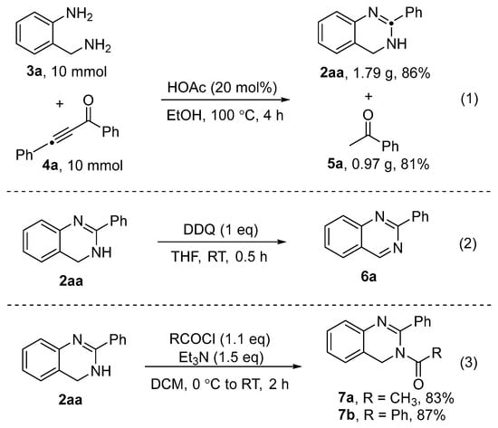 To validate the practicality of this acid-catalyzed cascade transformation, a gram-scale one-pot synthesis of 2-phenyl-3,4-dihydroquinazoline 2aa was carried out. Starting from 1.22 g of 3a (10 mmol) and 2.06 g of 4a (10 mmol), the reaction afforded 1.79 g of 2aa with an overall yield of 86% (Scheme 3, Equation (1)). Notably, the reaction also produced acetophenone 5a as a byproduct, which was isolated at an 81% yield. To further demonstrate the synthetic versatility of the obtained product, we explored its application in the preparation of quinazoline and acylated 3,4-dihydroquinazoline derivatives. The oxidation of 2aa using DDQ as an oxidant at room temperature resulted in the efficient formation of 2-phenylquinazoline 6a with a yield of 88% (Equation (2)). Additionally, 2aa underwent smooth acylation using acetyl chloride and benzoyl chloride as acylating agents to furnish the corresponding acylated products, 7a and 7b, with yields of 83% and 87%, respectively (Equation (3)).