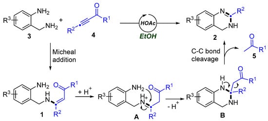 Based on our study and the previous literature [39,40,41,42,43], a plausible reaction mechanism was proposed (Scheme 4). With the help of HOAc, the Michael addition of 2-(aminomethyl)anilines 3 to ynones 4 would generate the enaminone intermediates 1. Iminoketone intermediates A may exist though the tautomerization of enaminones 1 in the presence of HOAc. Then, the intramolecular nucleophilic addition of 1 produced the intermediates B. After that, the C–C bond cleavage reaction occurred to generate the 3,4-dihydroquinazoline products 2 and byproduct 5.