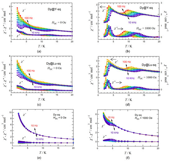 Figure 3 shows the χAC′ and χAC″ vs. T plots for Yb derivatives diluted with Y or Lu ions. Different magnetic behaviors were observed, depending on diamagnetic diluting ions at HDC = 0 Oe (Figure 3a,c,e). The Yb@Y-sq sample showed no frequency dependence. In sharp contrast, Yb@Lu-sq exhibited an increase in χAC″ in a low-temperature region. The bias field was chosen to be the same as in the previous work [12]. The Yb@Y-sq and Yb@Lu-sq samples exhibited similar frequency dependence around 4–7 K to each other at HDC = 400 Oe (Figure 3b,d), and their behavior partly resembled that of Yb-sq (Figure 3f). Namely, one peak appeared in common, but low-temperature behavior was different; in diluted samples of Yb@Y-sq and Yb@Lu-sq, the relaxation was sufficiently suppressed, while undiluted Yb-sq still showed a large susceptibility upsurge.