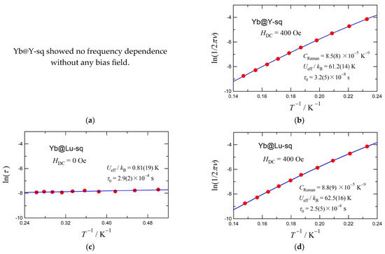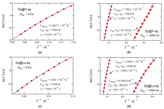 The Arrhenius plots for Dy@Y-sq and Dy@Lu-sq are shown in Figure 4, based on the frequency dependence of the χAC″ peak. The effective activation energy (Ueff) for the magnetization reversal and pre-exponential factor (τ0) were determined according to Equation (1) that includes the Raman relaxation process [17,18,19,40];