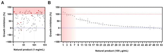 Screening for antimalaria effects of Korean native plant extracts. (A) The initial screening was performed on 151 plant extracts at a concentration of 1 mg/mL to assess their growth inhibition activity against P. falciparum (3D7). The red circle indicates natural products with hemolytic effect, while the grey circle indicates those without hemolytic effect. The red dashed line represents the positive control (CQ), demonstrating 100% antimalarial activity, while the blue dashed line represents the negative control (1% DMSO). (B) The secondary screening was conducted at a concentration of 100 μg/mL on 53 plant extracts that showed higher growth inhibition activity than CQ in P. falciparum (3D7) culture. The red background indicates the top seven natural extracts for P. falciparum growth inhibition (%). The red dashed line represents the growth inhibition activity of CQ, while the blue dashed line represents the negative control (1% DMSO).