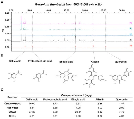 HPLC analysis and major contents of Geranium thunbergii extracts. (A) HPLC chromatogram of various fractions of G. thunbergii from 50% EtOH extraction: (a) G. thunbergii crude extract, (b) hot water fraction, (c) chloroform (CHCl3) fraction, (d) ethyl acetate (EtOAc) fraction, (e) mixed standard compounds. (B) Structures of major compounds from G. thunbergii. (C) Content of each natural compound (mg/g) from various fractions.