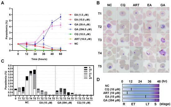 Plasmodium falciparum growth inhibition by ellagic acid (EA) and gallic acid (GA). (A) Parasitemia in P. falciparum treated with EA and GA was monitored at sequential time points by analyzing Giemsa-stained blood smears. Both compounds were tested at their IC50 concentrations and at 10-fold higher concentrations to assess parasite morphology upon death. EA, ellagic acid; GA, gallic acid; CQ, chloroquine; ART, artemisinin; NC, negative control which contained 0.5% DMSO. (B) Giemsa-stained thin smears were used to identify the predominant developmental stage and morphology of the parasites. (C) Proportions of parasite stages after treatment with high concentrations of EA (15 µM) and GA (394 µM) were recorded. dR, dead ring; R, viable ring; dT, dead trophozoite; T, viable trophozoite; dS, dead schizont; S, viable schizont. (D) Estimation of the effective time and stage of growth inhibition in response to high concentrations of EA and GA. R, ring; ET, early trophozoite; LT, late trophozoite; S, schizont stage.