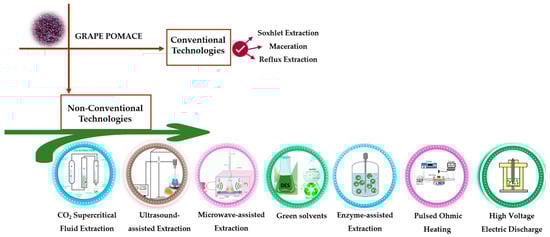 - Caldas, T.W.; Mazza, K.E.L.; Teles, A.S.C.; Mattos, G.N.; Brígida, A.I.S.; Conte-Junior, C.A.; Borguini, R.G.; Godoy, R.L.O.; Cabral, L.M.C.; Tonon, R.V. Phenolic Compounds Recovery from Grape Skin Using Conventional and Non-Conventional Extraction Methods. Ind. Crops Prod. 2018, 111, 86–91. [Google Scholar] [CrossRef]