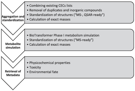 The three major steps and substeps in the pipeline to create an “MS-ready” database of CECs for screening in human samples. The first step is the aggregation of existing CECs lists and standardization to produce structure forms that can be measured with MS or are compliant with QSAR models. In the second step, metabolites are simulated, and their structures are standardized. In the final step, metadata are collected and predicted for physicochemical properties, environmental fate, and toxicity [82]. Reprinted with permission from Elsevier.