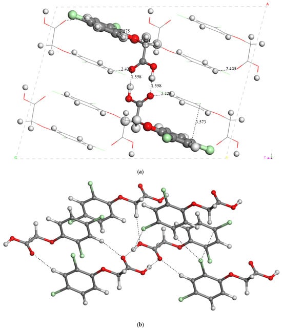 This region is specific to the ν(OH) and ν(CH) stretching vibration modes. The calculated frequency for the ν(OH) stretching in the 2,4-D molecule was 3636 cm−1, which is related with the experimental value of 2,4-D in the gas phase at around 3580 cm−1 [25]. However, the range of frequency decreased to 3251 when the 2,4-D was in non-polar dissolution due to various possible intermolecular interactions [19]. These interactions were confirmed with the band at 2495 cm−1 as the result of the dimerization process of 2,4-D [19]. Our calculations corroborated these assignments with bands at 2782–2628 cm−1 in the dimer and 2691–2576 cm−1 in the crystal structure, where hydrogen bonds were formed between the carboxylic H and O atoms. In the crystal structure, the intermolecular interactions altered the frequencies of some vibration modes. The numerous bands and the broadening of some of them in the frequency range of 3200–2500 cm−1 of the IR spectrum of 2,4-D [26,27,28] hint at the clustering of units in forming dimers. In other words, the formation of clusters was very likely. So, a bathochromic shift was consequently produced with respect to the isolated molecule frequencies.