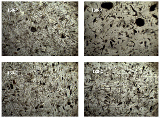 Light microscopy images (×10) of the PVA composites with different AS cellulose particles obtained by SWE at 160 or 180 °C and bleached with hydrogen peroxide (P) or sodium chlorite (C).