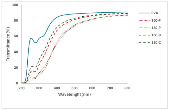 UV-Visible transmittance spectra of the PVA films without and with different AS cellulose particles obtained by SWE at 160 or 180 °C and bleached with hydrogen peroxide (P) or sodium chlorite (C).