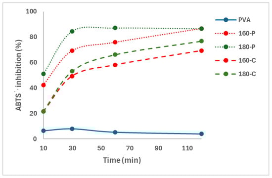 Inhibition of the ABTS∙+ radical by the PVA films without and with different AS cellulose particles obtained by SWE at 160 or 180 °C and bleached with hydrogen peroxide (P) or sodium chlorite (C).