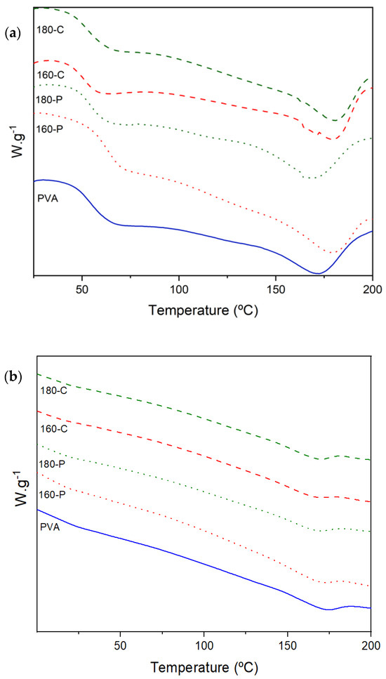 DSC thermograms (second heating step) obtained for PVA films without and with different AS cellulose particles obtained by SWE at 160 or 180 °C and bleached with hydrogen peroxide (P) or sodium chlorite (C), conditioned at 0% RH (a) and 53% RH (b).