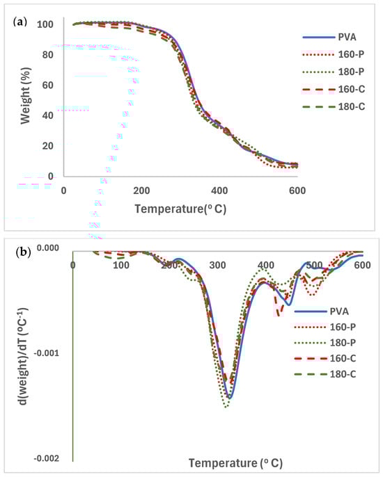 TGA (a) and DGTA (b) curves of the PVA films without and with different AScellulose particles obtained by SWE at 160 or 180 °C and bleached with hydrogen peroxide (P) or sodium chlorite (C).