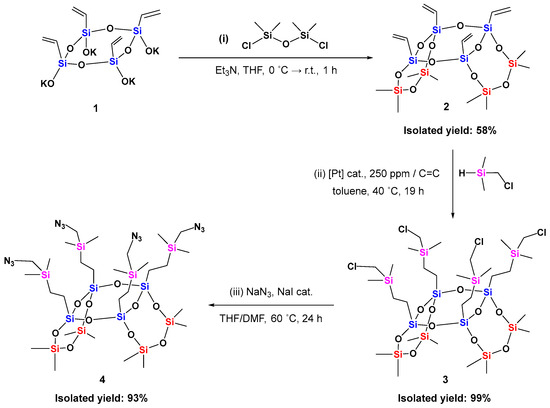 The syn-type tricyclic 8-8-8 laddersiloxane with four vinyl groups (compound 2) was previously synthesized in a total yield of 50% from all-cis-tetravinylcyclotetrasiloxanolate (1) via a two-step process: silylation with chlorodimethylsilane, followed by intramolecular cyclization in the presence of water, using B(C6F5)3 as a catalyst [20]. In this study, we developed a simplified one-step synthesis, starting from potassium all-cis-tetravinylcyclotetrasiloxanolate (1) and using commercially available 1,3-dichloro-1,1,3,3-tetramethyldisiloxane (Scheme 1, i). Precursor 1 was freshly prepared through controlled hydrolysis of tetraethoxyvinylsilane following a reported procedure [37], and thoroughly dried prior to use.