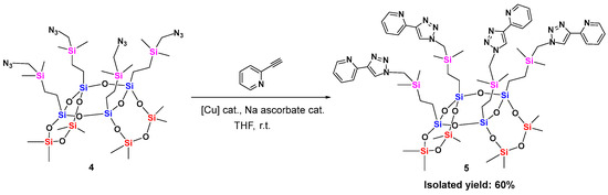 Synthesis of 2,2′,2″,2″′-((((((1R,3S,9R,11S)-5,5,7,7,13,13,15,15-octamethyl-2,4,6,8,10,12,14,16,17,18-decaoxa-1,3,5,7,9,11,13,15-octasilatricyclo[9.5.1.13,9]octadecane-1,3,9,11-tetrayl)tetrakis(ethane-2,1-diyl))tetrakis(dimethylsilanediyl))tetrakis(methylene))tetrakis(1H-1,2,3-triazole-1,4-diyl))tetrapyridine (5)