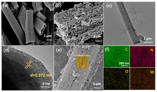 An obvious hollow tubular structure could be observed from the SEM and TEM images of TCN (Figure 1a,c). This was due to that the precursor melamine hydrothermally generating a hexagonal prismatic supramolecular structure of melamine–cyanuric acid (MC), and the center of the hexagonal prisms sublimed preferentially during thermal polymerization, resulting in the generation of a hollow micro-tubular structure. Considering that, the tubular structure was conducive to increasing the specific surface area of the catalyst; it promoted the adsorption and diffusion of reactants and active species, which, in turn, contributed to the enhancement of photocatalytic performance [21]. As illustrated in Figure 1b, following modification with WO3, the morphology of the 3%WO3@TCN composite retained its tubular structure, with the exception of spherical-shaped WO3 nanoparticles that were collected and aggregated on the surface of the material. When melamine underwent hydrothermal polymerization, a large amount of ammonia was released and dissolved in water, and WO3 reacted with ammonia to form ammonium tungstate ((NH4)2WO4). Subsequently, (NH4)2WO4 reacted with hydrochloric acid (HCl) in an acidic environment to form tungstic acid (H2WO4). Finally, WO3 was generated by high-temperature calcinations from H2WO4. The TEM image revealed that TCN and 3%WO3@TCN consisted of porous tubes with a tube size distribution from hundreds of nanometers to tens of micrometers (Figure 1c,e). As shown in Figure 1d, the image of 3%WO3@TCN presented distinct lattice fringes with a spacing of ~0.372 nm, consistent with the facet of WO3 [22]. Furthermore, EDS elemental mapping images of 3%WO3@TCN verified the homogeneous distribution of C, N, O, and W elements in the nanotubes, and the mass fractions of C, N, W, and O in the sample were 41.9%, 49.1%, 5.3%, and 3.7%, respectively (Figure 1f and Figure S1). The above results indicate that WO3 can be effectively loaded onto a carbon nitride substrate by the pH modulation method to form WO3@TCN heterojunctions. The formation of heterojunctions is conducive to increasing the specific surface area of the catalyst, increasing the number of active sites, and inhibiting the complexation of photogenerated electrons and holes, thus improving the photocatalytic activity.