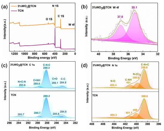The surface chemical compositions and chemical bonds of TCN and 3%WO3@TCN were further analyzed using X-ray photoelectron spectroscopy (XPS). The XPS survey scan (Figure 2a) confirmed that both samples contained the C, N, and O elements. In the 3%WO3@TCN framework, two weak W 4f peaks at 35.1 and 37.0 eV demonstrated the successful WO3 [23] doping (Figure 2b). As shown in Table S1, the O and W content occupied a certain mass ratio in 3%WO3@TCN, indicating the successful synthesis of WO3 in TCN. As depicted in the C 1 s spectrum of TCN (Figure 2c), the characteristic peaks at 284.8, 285.6, 288.2, 289.7, and 293.7 eV were attributed to the sp2 hybridized carbon atoms of C-C, C=O, C-N-C, C=NH, and N-C=N [24,25], respectively. 3%WO3@TCN exhibited similar peaks to TCN in the C 1s XPS spectra. The N 1s spectrum of TCN could be divided into four peaks of 398.6, 400, 401.1, and 404.3 eV (Figure 2d), attributed to C-N=C, N-(C)3, C-N-H, and N-O [24], respectively. The peak in the N-(C)3 spectrum of 3%WO3@TCN exhibited a noticeable shift ~0.20 eV towards a lower binding energy compared to the N 1s peak in TCN. This shift signified a weakened electron shielding effect, attributed to the increase in electron density [26].