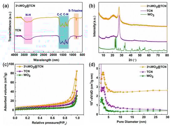 (a) The FT-IR spectra of TCN and 3%WO3@TCN catalysts; (b) XRD patterns; (c) N2 adsorption–desorption isotherms; and (d) pore size distribution of the WO3, TCN, and 3%WO3@TCN catalysts.