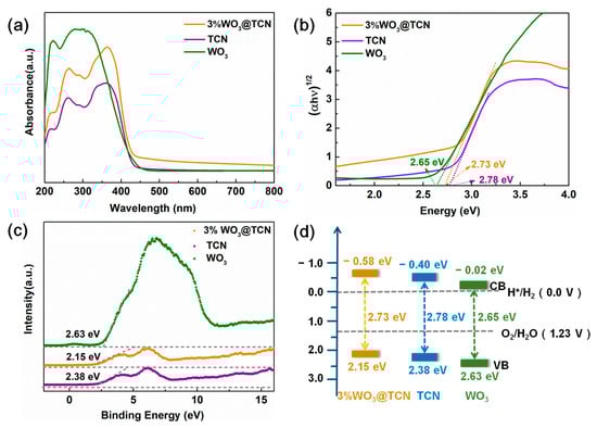 (a) UV-Vis DRS spectra; (b) band gap energy; (c) VB-XPS spectra; and (d) schematic diagram of energy band levels of WO3, TCN, and 3%WO3@TCN.