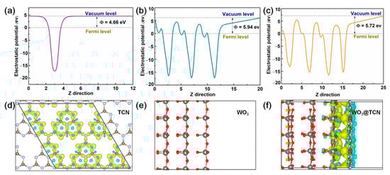 The work functions of (a) TCN; (b) WO3; and (c) WO3@TCN. The electron distributions of (d) TCN; (e) WO3; and (f) WO3@TCN.
