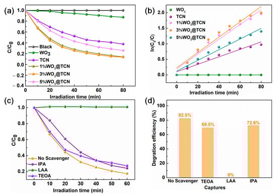 In this study, the photocatalytic activity of the catalysts was evaluated using TC as the degradation prototype. Prior to illumination, a 40 min adsorption–desorption equilibrium dark reaction was performed. As shown in Figure 6a, the concentrations of TC remained largely unaltered in the absence of the catalyst. However, the introduction of different types of catalysts could have resulted in varying degrees of degradation of pollutants. As a control, the degradation rates of TC by WO3 and TCN were 10.6% and 67.3%, respectively, within 80 min. These results indicated that WO3 did not possess significant photocatalytic properties, while TCN exhibited higher degradation efficiency. Notably, the combination of WO3 with TCN resulted in the WO3@TCN composite exhibiting enhanced degradation efficiency compared to the individual materials. We also conducted three parallel experiments, and the 3%WO3@TCN photocatalyst showed stable photocatalytic degradation efficiency of tetracycline (Figure S3).