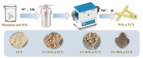 Typically, WO3 (30.0 mg) was added to the melamine solution and stirred for another 30 min. Following that, the solution was transferred into a 100 mL Teflon-lined stainless steel autoclave and subjected to hydrothermal processing at 180 °C for 24 h. The solution was then allowed to cool naturally to room temperature, and the pH was adjusted to 5~6 using hydrochloric acid. The precursor product was isolated by centrifugation, thoroughly washed with ultrapure water and ethanol multiple times, and finally dried overnight. The solid was dried in an oven at 80 °C overnight to obtain the modified precursor product, which was placed into an alumina crucible and heated from 30 °C to 500 °C at a 2 °C/min ramping rate under an N2 atmosphere. Then, the sample was naturally cooled to 30 °C, and a powder was yielded with WO3-modified carbon nitride nanotubes (1%WO3@TCN). Finally, 3% and 5%WO3@TCN were also prepared according to the above procedure. Scheme 1 presents the preparation process diagram.