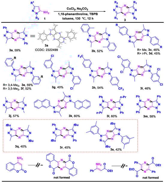 Next, due to the emergence of new configurations, we tested different species of 5-aminopyrazoles to synthesize dipyrazole-fused pyrazines (Figure 3). When R1 is a methyl group, different substituted substrates (e.g., 2-Me, 4-Me, 4-iPr, 3,4-(Me)2, 3,5-(Me)2, 3-Cl, 4-CF3, 2,4-Cl2) on phenyl rings 1b–1i could participate in this reaction, giving the desired products 3b–3i in 40–59% yields. To our delight, compared to phenyl-substituted 5-aminopyrazoles, methyl- and naphthalene-substituted substrates also worked well, giving the corresponding products in moderate yields (3j–3k, 57–60%). When R2 is phenyl, whether R1 is alkyl or aryl (e.g., -nPr, -Ph), these substrates performed the reactions smoothly to give the desired products in medium yields (3l–3m, 58–60%). Meanwhile, in this transformation process, whether R1 or R2 is tert-butyl can also be tolerated, leading to the final products being in moderate yields (3q–3s, 40–45%). In the same way, under the conditions shown in Figure 3, both 4-amino-2H-chromen-2-one and ethyl (E)-3-amino-3-phenylacrylate cannot produce the desired target products.