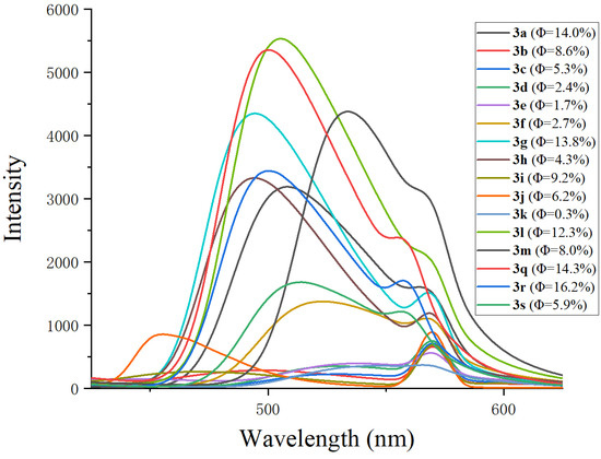 Most of the synthetic compounds showed a fluorescent nature during UV monitoring (see Supplementary Materials Figure S4). We proceeded to characterize their fluorescence performance (Figure 4 and Figure 5). The UV absorption wavelengths of compound 2 ranged from 266 to 309 nm. The fluorescence emission of them ranged from 293 to 511 nm (Table 3). In compound 2, when R1 is a methyl group and R2 is a benzene ring, the quantum yield of most products with different substituents on the benzene ring (2b–2d, 2f–2i) is higher than that of unsubstituted products (2a). The quantum yields of the bis-methyl-substituted product (2j) were slightly higher than those of the bis-phenyl-substituted product (2m). The UV absorption wavelengths of compound 3 ranged from 274 to 304 nm. The fluorescence emission of them ranged from 474 to 544 nm (Table 4). Interestingly, the above fluorescence quantum yield trend observed in compound 3 is opposite to that of compound 2. Finally, we tested the effect of solvent polarity on the fluorescence spectra and found that compounds 2 and 3 both showed significant red and blue shifts in DCM and toluene, while the emission maxima in ACN, DMSO, and CH3OH were almost the same (Figure 6).