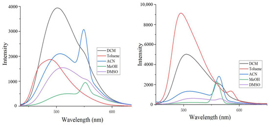 The fluorescence emission spectra of 2a (left) and 3l (right) in CH2Cl2, toluene, ACN, CH3OH, and DMSO at a concentration of 1 × 10−5 mol/L.