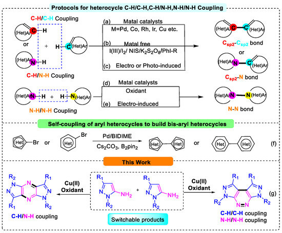 The reported strategies for the synthesis of C(sp2)-C(sp2)/C(sp2)-N/N-N bonds via cross dehydrogenative coupling (a–f) and this work (g).