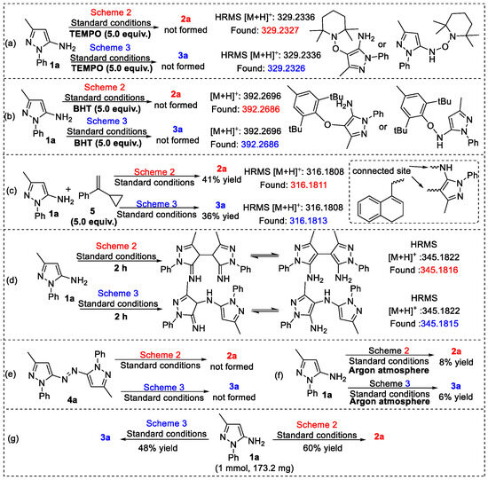 To establish the mechanism, several control experiments were conducted. The addition of the radical scavenger TEMPO or BHT (5.0 equiv.) under the standard conditions of Scheme 2 or 3, respectively, was found to completely inhibit the formation of 2a or 3a. The crude reaction solution was subjected to HRMS, with the product of 1a binding to TEMPO or BHT, which could be found under the two conditions, respectively (Scheme 2a and 2b). This demonstrated that this reaction was performed involving the radical pathway. Then, 1a was reacted with (1-cyclopropylvinyl) benzene 5 (5.0 equiv.) under Scheme 2 or Scheme 3 standard conditions, and the results showed that the yields of both 2a and 3a were decreased, and the adduct could be detected in the crude reaction solution through HRMS (Scheme 2c). Moreover, the production of potential intermediates was, respectively, detected by HRMS after 2 h of the Scheme 2 or Scheme 3 reactions (Scheme 2d). We assessed whether the azo compound (E)-1,2-bis(3-methyl-1-phenyl-1H-pyrazol-5-yl) diazene 4a could produce 2a or 3a under Scheme 2 or Scheme 3 standard conditions; the results showed that 2a or 3a was not produced, suggesting that 4a is not a reaction intermediate (Scheme 2e). We then tested the reaction with Scheme 2 or Scheme 3 standard conditions under argon atmosphere and found that the yield was only 8% for 2a and 6% for 3a, thus demonstrating that oxygen is necessary for the reaction to proceed (Scheme 2f). As shown in Scheme 2g, when the amount of substrate 1a was scaled-up to 1.0 mmol, the products 2a and 3a could still be obtained in 60% and 48% yields, respectively.