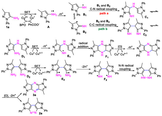 Based on our observations and literature reports [46,47,48], a plausible reaction mechanism is depicted (Scheme 3). 5-Aminopyrazole (1a) reacted with Cu(II) to give intermediate A through a SET pathway. After the deprotonation, N radical B1 or C radical B2 may form. In path a, B1 and B2 underwent C-N radical coupling to generate intermediate C1, which could undergo structural mutual transformation to obtain D1. D1 underwent Cu-mediated one-electron oxidation and deprotonation to obtain N radical E1. Subsequently, F1 was obtained by radical addition. 3a could finally be achieved through successive Cu-mediated SET, deprotonation, and oxidative dehydrogenation from intermediate F1. In path b, B2 and B2 underwent C-C radical coupling to generate intermediate C2, which could undergo structural mutual transformation to obtain D2. Amino cationic radical E2 was obtained through Cu-mediated SET. E2 lost two protons to obtain N radical F2. From F2, N-N radical coupling and oxidative dehydrogenation successively occurred to form 2a.