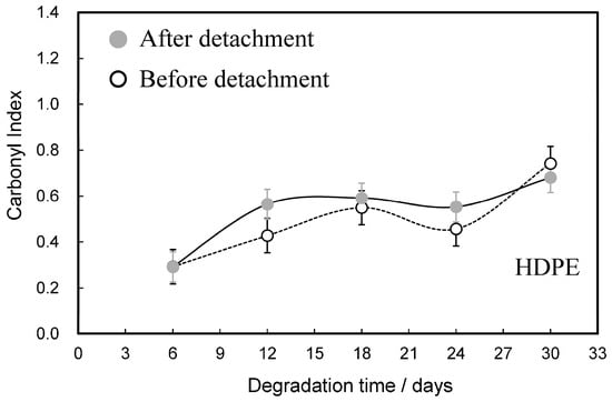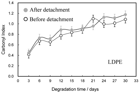 Comparisons of degradation time dependences of carbonyl index before and after detachment of LDPE samples. Error bars indicate the difference from the mean.
