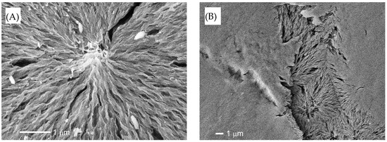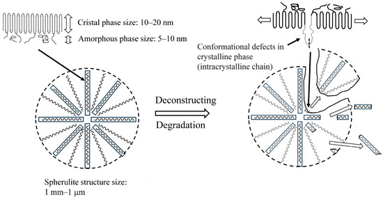 The SEM photographs of 12-day degraded HDPE films before and after detachment are shown in Figure S1. The SEM images prior to the detachment show etching due to degradation, resulting in a distinct lamellar texture. In the SEM image after the detachment, the lamellar texture is not observed, and, instead, remnants of the spherulite structure can be seen. The initiation and progression of the degradation reaction require radical species to serve as initiators and oxygen molecules to allow for the degradation to proceed. Therefore, compared to the crystalline phase, the degradation selectively occurs in the amorphous phase, which is easier to penetrate and diffuse. The distinct lamellar texture observed in Figure S1A is due to the selective degradation of the amorphous part. It appears that selective degradation occurs not only in the amorphous part, but also in some of the crystalline parts at the same time. The remnants of the spherulite structure, which represent the higher-order structure seen in Figure S1B, show that the lamellar crystal part of the skeletal structure has been partially degraded by the degradation, making it brittle. In the 30-day film, which has been degraded longer, some of the lamellae that extend radially to form the spherulite structure are observed to be missing, as shown in Figure 2A. The length of these defects is often less than 1 µm, and the detached pieces can be considered NP. Defects in larger spherulite structural units are observed after the detachment process. This specific exfoliation behavior suggests that some lamellar parts that form the spherulite structure are susceptible to degradation and selectively break and detach. As shown in Figure 2A, the lamellar crystals of HDPE grow while twisting in a helical shape [18]. Semi-crystalline-like HDPE is composed of crystalline and amorphous phases. Loose intracrystalline chains exist within the lamellar crystals of HDPE [19]. The areas where these loose chains exist would be defective areas where radicals and oxygen can enter more easily than other regions formed by tight chains. Due to the shear stress involved during the detachment process, the spherulites with many defects in these lamellae break off in parts of the spherulite structure, causing detachment, as observed in Figure 2B. In semi-crystalline polymers with a spherulite structure like HDPE, as shown in Figure 3, conformational defects in the crystalline phase cause loose chains in the crystal, which become the starting point for fracture during the degradation, resulting in partial cracking and detachment of the lamellar crystal. Table S1 summarizes the melting point, fusion enthalpy, and crystallinity of each sample at each degradation time. These values of both samples before and after detachment gradually decrease with increasing degradation time. The behavior after the decrease in melting point of both is roughly the same, but the point where the melting point of the detached sample after 30 days of degradation is 6 °C lower than that of the undegraded sample is particularly striking. The change in fusion enthalpy, that is, the change in crystallinity, shows an oscillation range of less than 10%, except for the sample with 24 days of degradation before detachment. As the degradation time increases, the slight decrease in melting point and crystallinity suggests that the thickness of the crystalline lamellae is decreasing and that the amorphous phase is being selectively removed. The results of the melting point and crystallinity change behavior support the inference that the clear lamellar texture seen in Figure S1A is due to the etching of the amorphous phase. In addition, the conformational defects in the crystalline phase (lamellae) lead to the collapse of the lamellae. Such complex melting point and crystallinity reduction behaviors result from both selective etching and conformational defects. In addition, the reason for the significant decrease in melting enthalpy of the degraded sample on the 24th is unclear, but it is likely that there are parts that have degraded so much that even the crystalline parts that have a high melting point have been destroyed. If the degradation time is even longer, it is thought that these parts will no longer have a melting point and will not be observed. Since HDPE disintegrates in units of spherulite structures by the conformational defects in lamellae, the size of the fragments obtained has a wide distribution, as shown in Figure 4. There is no clear degradation time dependence on the fragmentation size, and the errors are large. HDPE is a semi-crystalline polymer with a higher-order structure called a spherulite structure, so, in the process of degradation and fragmentation, fine fragments are generated from the amorphous, crystalline, and spherulite regions that make up the polymer. This difference in the generation matrix results in the generation of fine particles with a wide range of sizes from nano- to micro-sized, independent of the degradation time.