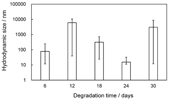 Degradation time dependence of hydrodynamic size of HDPE fragments collected after delamination treatment. Error bars indicate the difference from the mean.