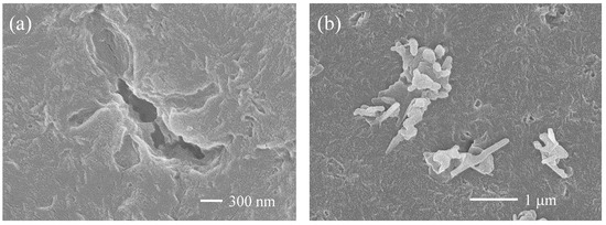 SEM photographs of detachment LDPE samples after degradation for 24 days: (a) surface pits (×30,000), and (b) recovered fragmentations (×20,000).