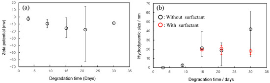 Comparison of (a) degradation time dependence of zeta potential, and (b) hydrodynamic size values after detachment of LDPE samples after degradation.