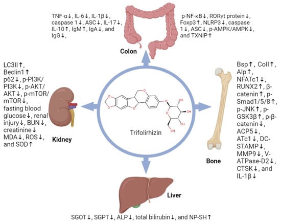 Protective activity of trifolirhizin against different organs. (↑: up-regulation; ↓: down-regulation/inhibition).