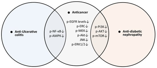 The anticancer activity of trifolirhizin can be considered as one of the most important pharmacological properties, as it was observed against various types of cancers including lung, gastric, ovarian, nasopharyngeal, hepatocellular carcinoma, and colorectal cancer [5,6,7,8,9,10]. Notably, in several studies, the anti-proliferative activity of trifolirhizin was found to be specific to cancer cells, and normal cells were found to be safe or mildly affected, which highlighted its safety profile and again emphasized its candidature as an anticancer drug candidate [5,6,10]. The target pathways in most of these studies were also analyzed to decipher molecular mechanisms and optimize the anticancer activity of trifolirhizin. Important anticancer pathways such as EGFR-MAPK, PI3K/Akt, AMPK/mTOR, ERK, and AKT were found to be targeted by trifolirhizin. These targets are considered core targets and are associated with various types of cancers, which explains the basis of the anticancer activity of trifolirhizin against different types of cancer. Some of these pathways were also found to be targeted in other activities of trifolirhizin, such as anti-DN and anti-UC (Figure 2). It is known that anti-inflammatory activity can also contribute to anticancer activity.