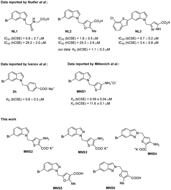 The most active inhibitors of bacterial CGL are represented by the 6-bromoindole class of derivatives []. Since 2021, several variants of such derivatives have been synthesized with good activity at micromolar and submicromolar concentrations bearing additional furan [,], pyrazoline [] or thiophene [] heterocycles in their structure, as well as the benzoic acid moiety [,] (Scheme 1). The first series—NL1, NL2 and NL3 inhibitors—were introduced by Dr. E. Nudler’s group [], and then, their synthesis was subsequently optimized for preparative procedures in gram quantities [,]. A number of compounds with the 6-bromoindole moiety were inspired by the NL2 structure, including the aminothiophene derivative MNS1 that we recently synthesized and characterized as superior to NL2 in terms of activity toward CGL []. MNS1 features one of the highest binding constants, with CGL at a level of 600 nM. Biological testing has revealed isosteric resemblance and a number of structural aspects that may give an opportunity to improve the targeted development of new inhibitors, although it has not been possible to omit the 6-bromoindole moiety so far. In this study, we focus on further modifications of NL2- and MNS1-based inhibitors, repositioning their structural moieties and further replacing the 6-bromoindole moiety with the 6-bromoindazole residue (Figure 1).