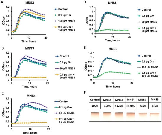 Determination of the potentiating properties of compounds. Representative growth curves of B. subtilis 168 strain in the presence of 0.1 μg/mL gentamicin (Gm) and potentiators: MNS2 (A), MNS3 (B), MNS4 (C), MNS5 (D) and MNS6 (E). The cells were grown at 37 °C with aeration in a Bioscreen C automated growth assay system. The curves represent the mean values of three independent experiments with an error of <5%. Evaluation of hydrogen sulfide production by B. subtilis 168 cells in the presence of the potentiators studied (F): MNS2 (100 µM), MNS3 (90 µM), MNS4 (60 µM), MNS5 (60 µM) and MNS6 (100 µM). The filter paper strips soaked in 2% lead acetate solution show brown staining with PbS salt as a result of H2S evaporation by the bacterial suspension. The numbers indicate H2S production relative to wild-type cells.