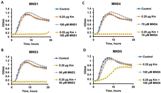Determination of the potentiating properties of compounds. Representative growth curves of B. subtilis 168 strain in the presence of 0.25 μg/mL kanamycin A (Km) and potentiators: MNS2 (A), MNS3 (B), MNS4 (C), MNS5 (D).