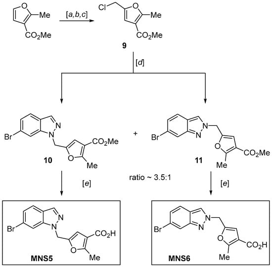 To evaluate the isosteric effect of the 6-bromoindazole moiety on activity, two new analogs of NL2 were synthesized. Following the procedure for NL2, 6-bromoindazole-containing MNS5 and MNS6 were synthesized by coupling two heterocyclic fragments with the following hydrolysis of the ester group in the last step (Scheme 3). Methyl 5-(chloromethyl)-2-methylfuran-3-carboxylate 9 can be prepared from commercially available methyl 2-methylfuran-3-carboxylate via the previously reported synthetic route of formylation reactions, reduction of the resulting aldehyde with sodium borohydride and substitution of the hydroxyl group with chloride via methanesulfonyl chloride [,,]. Product 9 was used as the furan building block for direct alkylation of 6-bromoindazole.