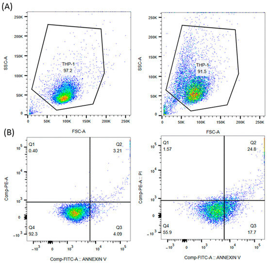 For a better understanding of the FITC Annexin V/Propidium Iodide method used in this study, the results of a representative experiment on the THP-1 monocyte cell line treated with the highest concentration of F− (1200 µM) used in our experiments after 48 h of incubation are shown in Figure 8.