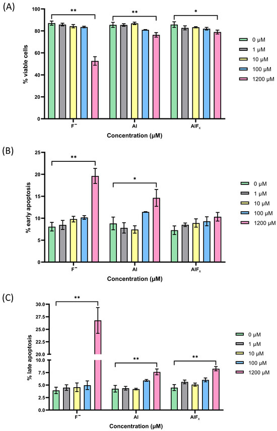 Representative histograms of the flow cytometric analysis after exposure to different concentrations (1 µM, 10 µM, 100 µM and 1200 µM) of F−, Al or AlFx standard solutions for 48 h are shown in Figure 9. Plots (A), (B) and (C) represent the percentage of viable cells, early apoptotic cells and late apoptotic cells, respectively. Necrotic cells were excluded from the analysis as their percentage was negligible over the entire concentration range for all three standards analyzed.