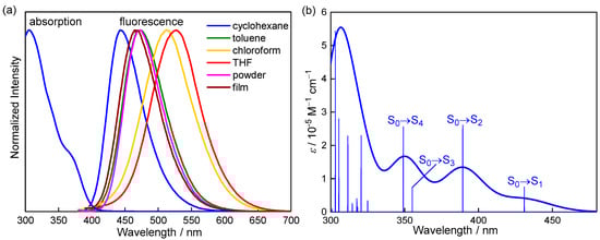 (a) Absorption spectra in cyclohexane and fluorescence spectra (λex = 380 nm) in various solvents and solid state, and (b) calculated UV−vis absorption spectra in the optimized S0 geometry (calculated at the PBE0/6-31G(d) level) for m-BPhANPh2-Cp.