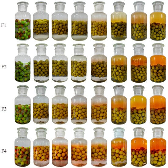 Color variation of fruit-steeped mume wine made from 42%vol base wine. Note: the pictures were taken from left to right after 1 day, 1 week, 2 weeks, 3 weeks, 4 weeks, 8 weeks, 12 weeks, and 14 weeks of maceration. The meaning of F1–F4 see Table 3.
