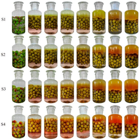 Color variation of fruit-steeped mume wine made from 65%vol base wine. Note: the pictures were taken from left to right on the first day after 1 day, 1 week, 2 weeks, 3 weeks, 4 weeks, 8 weeks, 12 weeks, and 14 weeks of maceration. The meaning of S1–S4 see Table 3.