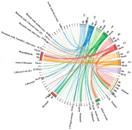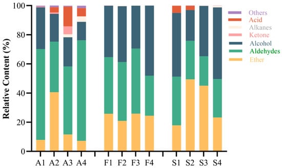 The volatile components of F1–F4 did not change greatly with the change in fruit maturity. The content of esters accounted for 20~30% of the total volatile components. The content of aldehydes was stable at about 40% in the early stage and dropped to 27.4% after F3. The proportion of esters in S1–S4 was similar to that in A1–A4. The content of esters was the highest in S2, which mainly included ethyl acetate, ethyl butyrate, ethyl 3-methylvalerate, propyl lactate, etc. The content of aldehydes also maintained the characteristics of the fruit, which was relatively high in S1 and S4 and relatively low in S2 and S3. It is worth mentioning that the acid content of S1 and S2 substances was high, mainly pentanoic acid and a small amount of butanoic acid. With the increase in fruit ripeness, the content of acids in the impregnated wine decreased, opposite to the fruit (See annexed Tables S1–S3 for more aroma components data).